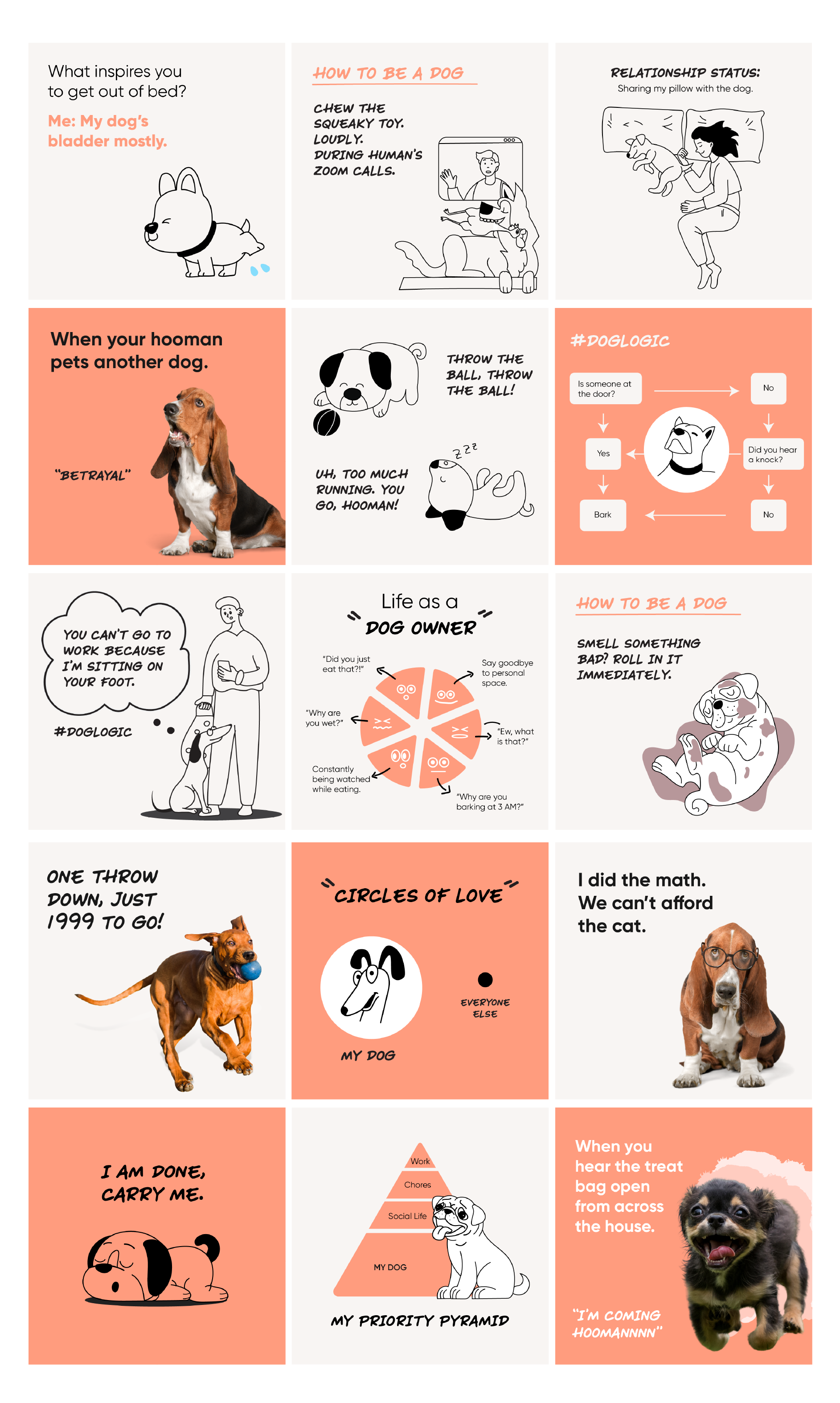 Created a series of meme-style social media posts for a dog food company, using relatable pet humour, simple illustrations, and playful layouts to make the brand feel more engaging and shareable.